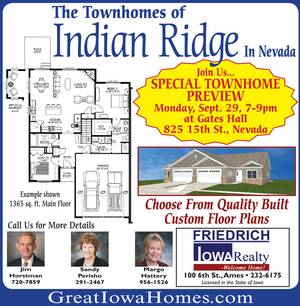 Friedrich Iowa Realty and agents Jim Horstman, Sandy Perisho and Margo Hattery are hosting a special event highlighting the new Townhomes of Indian Ridge in Nevada from 7 to 9 p.m. Monday, September 29. The event will be held at Gates Hall, 825 15th Street.