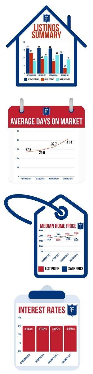 Only 17 new listings were introduced to the market in December of 2021, and while the number of sold listings dipped to 45, the number of solds out paced the new listings by 28. That brought the number of active listings to a quarterly low of just 63 listings on the market at the end of December — a normal sign of the season.